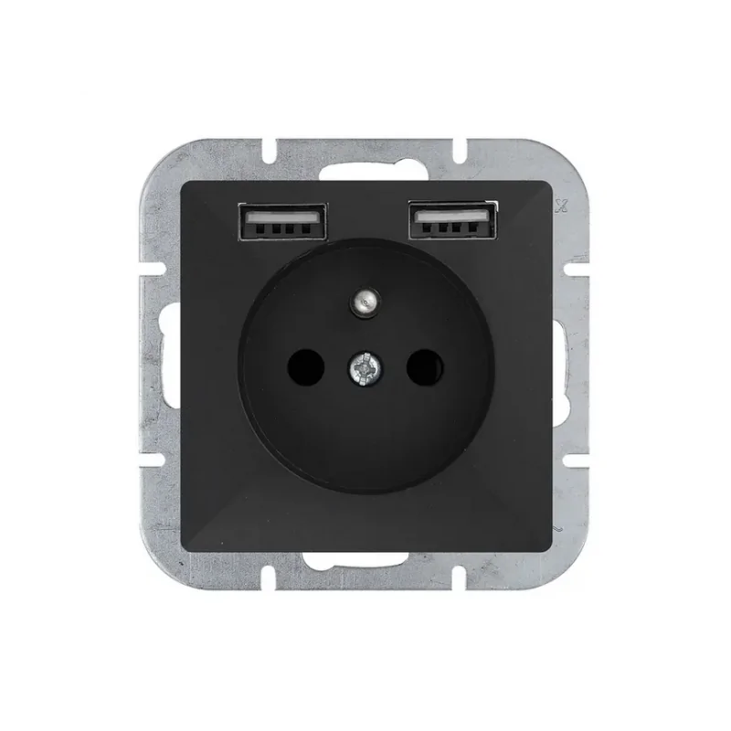 Gniazdo pojedyncze czarne PERŁA . Wersja z uziemieniem. Do włącznika pasują ramki z serii PERŁA. Gniazdo posiada 2 wejścia USB 2A 5V.
