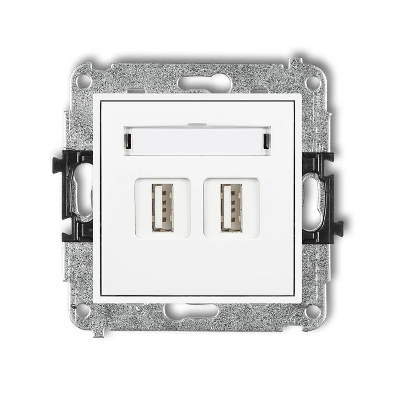 Podwójne gniazdo USB-AA koloru białego serii MINI firmy KARLIK, przeznaczone do montażu podtynkowego. Gniazdo wymaga dokupienia ramki serii MINI firmy KARLIK.
