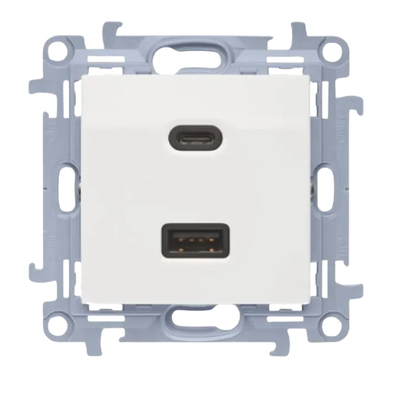 Podwójna ładowarka USB C+A serii Simon 10 marki Kontakt-Simon, prąd znam. 3,1A.