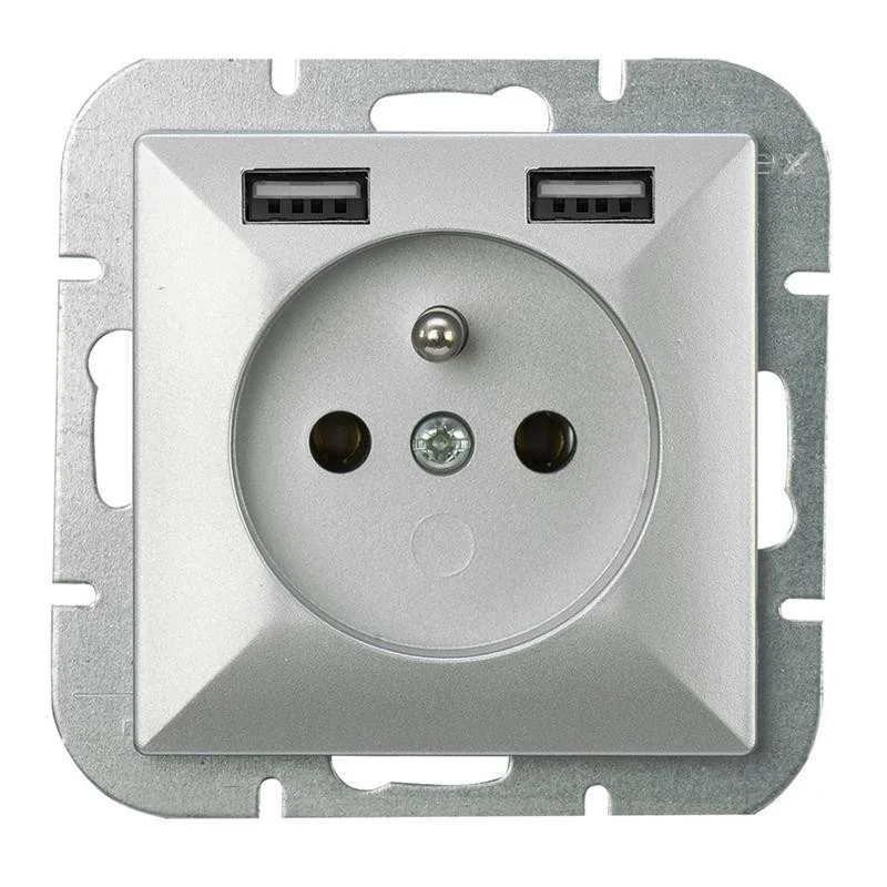 Srebrne gniazdo pojedyncze z uziemieniem z ładowarką USB