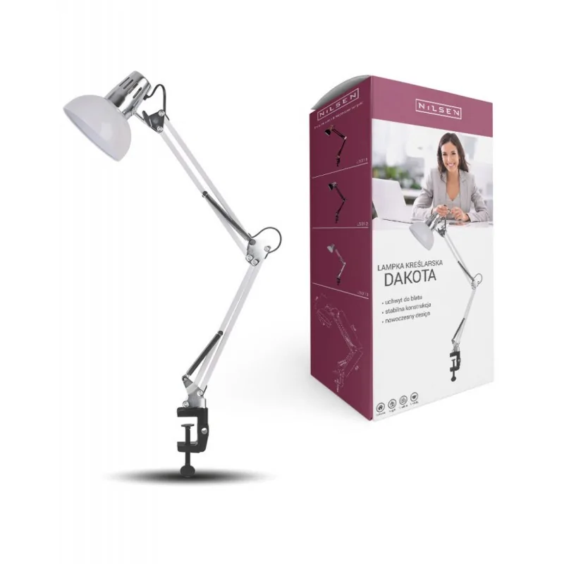 Kreślarska lampka na biurko DAKOTA marki NILSEN wyposażona została w uchwyt ułatwiający montaż do blatu. Prezentowany model lampki doskonale oświetli Twoje miejsce do pracy czy do nauki. Produkt posiada ruchome ramię oraz klosz, dzięki czemu skierujesz światło w dowolnym kierunku. Lampka w biało-chromowanym kolorze łatwo dopasuje się do aranżacji oraz będzie doskonałym prezentem dla każdego. Dodatkowo sprzedawana jest bez źródła światła w zestawie, dlatego samodzielnie dobierzesz moc i barwę żarówki E27 do własnych potrzeb. Dedykowane źródło światła lampki biurkowej nie powinno przekraczać mocy 60W. Lampka DAKOTA dostępna jest również w innych kolorach.