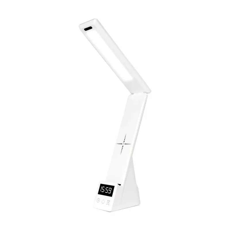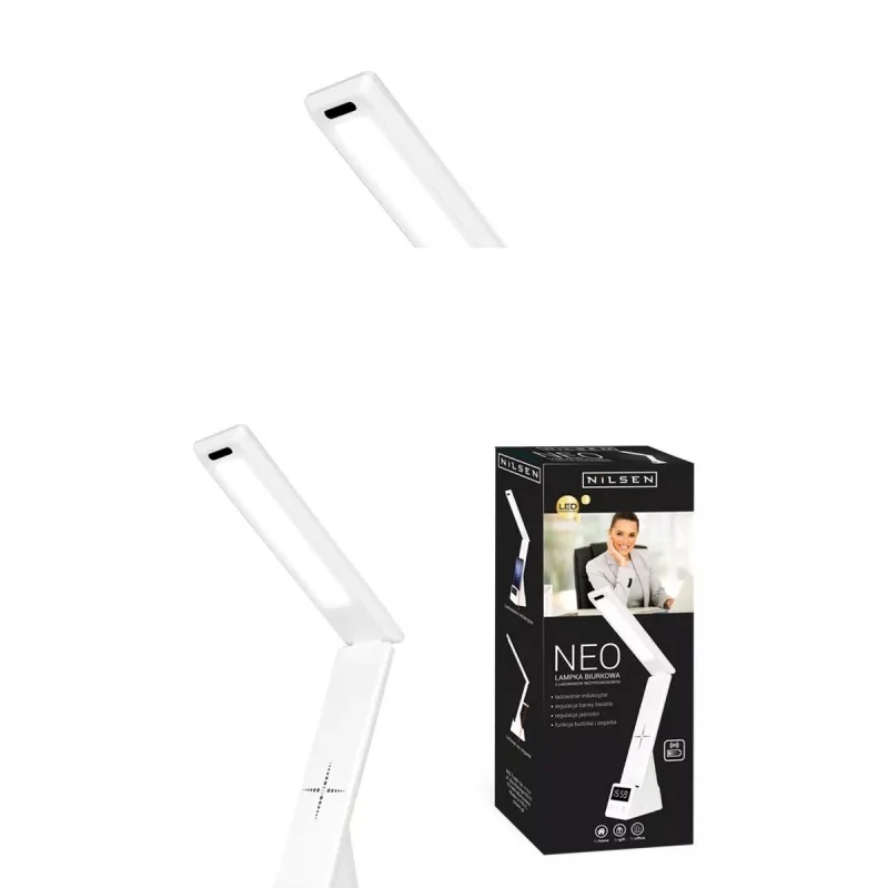 Biała lampka biurkowa led z ładowarką indukcyjną zegarem i budzikiem USB NEO 0NILSEN MA020E