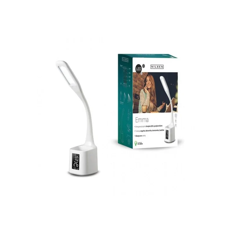 Biurkowa lampka led EMMA HG014 firmy Nilsen jest w kolorze białym, dzięki czemu dopasuje się do każdego wnętrza. Produkt będzie świetnie prezentował się w biurze, gabinecie, jak również w pokoju nastolatka. Lampka led na biurko posiada funkcję zegarka, datownika, termometru oraz budzika, co ułatwi Ci pracę. Prezentowany model lampki wyposażony został w przybornik, do którego możesz schować najpotrzebniejsze przybory i będziesz miał je pod ręką. Elastyczna konstrukcja produktu sprawia, że możesz skierować promień świetlny w wybranym przez siebie kierunku. Biurkowa lampka led firmy Nilsen posiada również 3-stopniową regulację jasności i objęta została 12-miesięczną gwarancją producenta. Temperatura barwowa produktu równa jest 5500K, a jego strumień świetlny wynosi 240 lumenów.