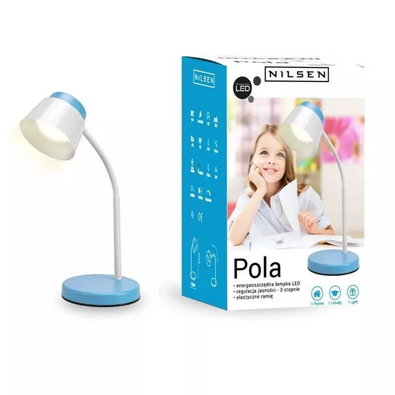 Lampka POLA – to niezwykle urocza i zgrabna lampka, która idealnie nadaje się do pokoju dziecięcego. Wyróżnia ją oszczędna forma oraz żywy, niebieski kolor. Lampka świetnie sprawdzi się na stoliku nocnym, będzie też świetnym kompanem do nauki. Wbudowane źródło światła LED zapewnia jasne i energooszczędne światło. Regulowana szyjka lampki pozwala na ustawienie odpowiedniej wysokości i kąta padania światła. Neutralna barwa światła 4000K idealnie nadaje się do nauki, sprzyja skupieniu i zachowaniu koncentracji. Atutem lampki jest 3 stopniowa regulacja natężenia światła, która pozwala dopasować jasność do nastroju i danej aktywnoci. Model działa z mocą do 6W świecąc neutralnym białym światłem.