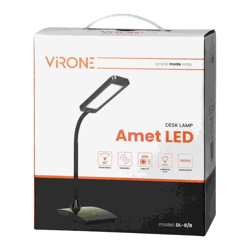 Nowoczesna lampka biurkowa DL-8/B LED z kolekcji AMET posiada elastyczne, regulowane ramiennie, które umożliwia wygodne skierowanie kierunku świecenia, tam gdzie potrzebujemy. Dotykowy przycisk sterujący oraz funkcja ściemniania (3 stopniowa regulacja intensywności świecenia). Czarne oświetlenie biurkowe marki ORNO, zostało wyposażone w energooszczędny LED, który ma moc 6W oraz świeci ciepła barwą światła o temperaturze barwowej 3000K. Dostępne kolory: biały, czarny.