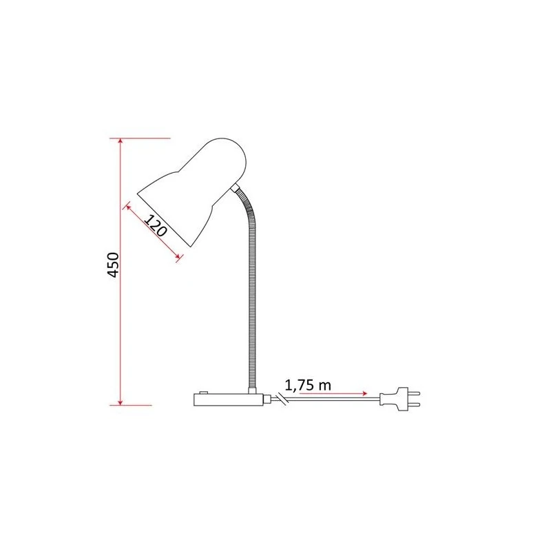 Czarna lampka biurkowa 60W E27 to kompaktowe tradycyjne oświetlenie idealne jako lampka na biurko czy stolik nocny. Lampka L1 pasuje do wszystkich wnętrz, ze względu na jej uniwersalny kształt, kolor i charakter. Jej wymiary to wysokość max.: 450mm oraz średnica 120mm. Lampka L1 nie zawiera w komplecie źródła światła. Lampka dedykowana jest żarówkom E27 do mocy 60W. Produkt posiada stopień odporności IP20. Czarna lampka do odrabiania lekcji posiada włącznik on/off w podstawie. Elastyczne ramię małej lampki pozwala na regulację kierunku padania światła. Model dostępny jest także w innych kolorach. Przewód zasilający lampkę posiada 1.75m długości i płaską wtyczkę.