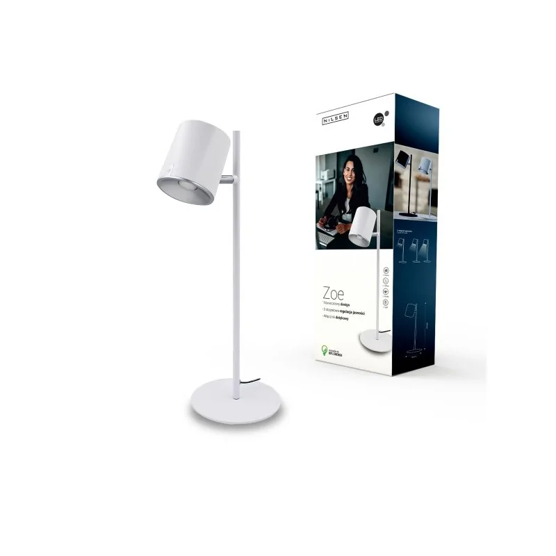 LED-owa lampka na biurko serii ZOE LED PX042 marki NILSEN to eleganckie oświetlenie biurka, które idealnie spisze się w biurze czy w pokoju nastolatka. Nowoczesny, a zarazem prosty styl sprawi, że produkt świetnie będzie prezentował się w każdym pomieszczeniu. Lampka na biurko została wyposażona w zintegrowane źródło światła LED o przybliżonym działaniu do 20000h oraz 15000 cykli on/off. Na kloszu lampki umieszczony został włącznik. Prezentowany model oświetlenia biurkowego świeci neutralną białą barwą światła, która jest przyjemna dla wzroku, a jej temperatura barwowa to 4000K. Moc strumienia świetlnego lampki jest równa 450 lumenów. Biała LED-owa lampka na biurkowa posiada przewód o długości 160 cm i należy do klasy energetycznej A.