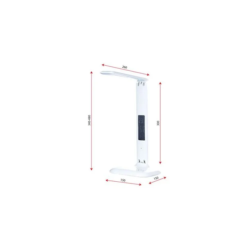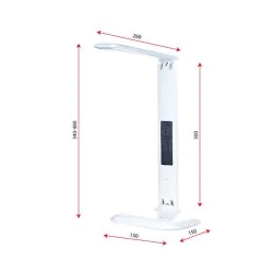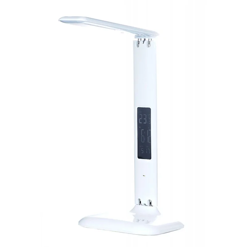 Lampka biurkowa HD1408S LED marki RUM-LUX, to połączenie eleganckiego designu, wygody oraz praktyczności, posiada 3-stopniową regulację barwy światła: ciepła | neutralna | zimna oraz system EYE PROTECTION (ochrona oczu). Dodatkowo wyposażona jest w zegar, kalendarz, termometr oraz budzik. Jest to energooszczędne oświetlenie pobierające moc 7W, charakteryzuje się również długim okresem działania. Lampka stołowa wykonana została z plastiku w uniwersalnym białym kolorze, który dopasuje się do każdego pomieszczenia. Ruchome ramię pozwala na ustawienia strumienia światła w dowolnym kierunku, zapewnia to komfort w użytkowaniu i lepsze oświetlenie powierzchni.