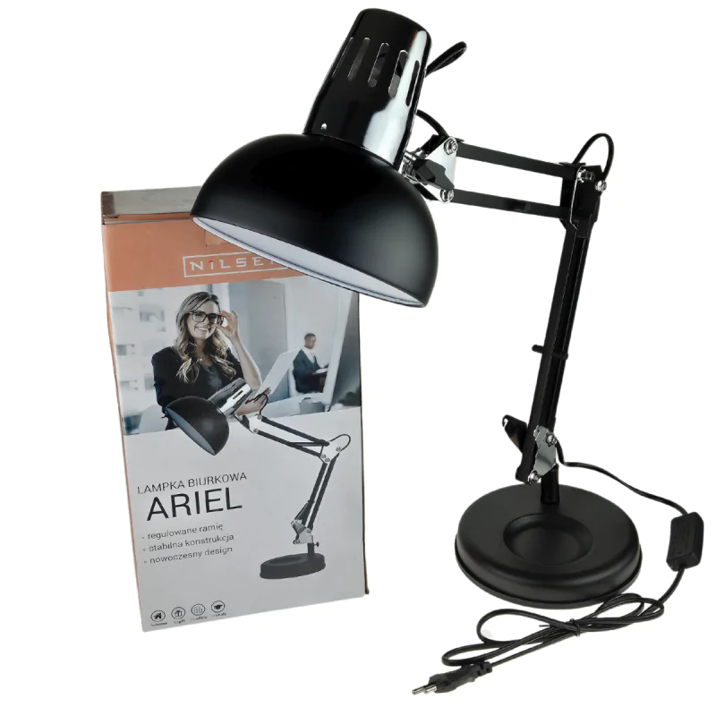 Lampka ARIEL zachwyca nowoczesnym wyglądem, łączącym czarno-srebrne wykończenie, które doskonale pasuje do modnych wnętrz. Jej elegancki design sprawia, że jest nie tylko funkcjonalnym elementem wyposażenia, ale także stylowym akcentem w biurze lub pokoju.