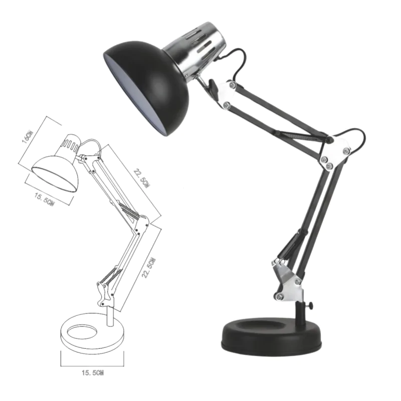 Wykonana z metalu lampka typu kreślarskiego gwarantuje solidność i trwałość. Wysokiej jakości materiały zapewniają długą żywotność produktu, dzięki czemu będzie on służyć przez lata, zachowując swoje estetyczne i funkcjonalne właściwości. Dzięki kompatybilności z trzonkiem E27, można zastosować różnorodne źródła światła o mocy do 60W, dostosowując je do preferowanej intensywności i barwy światła, aby stworzyć idealne warunki do pracy, nauki czy relaksu.