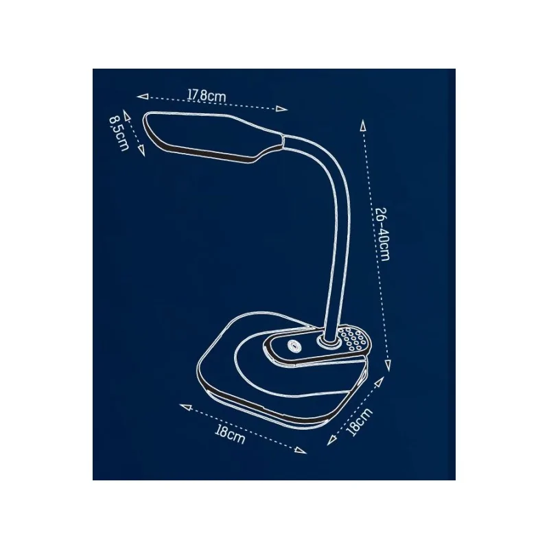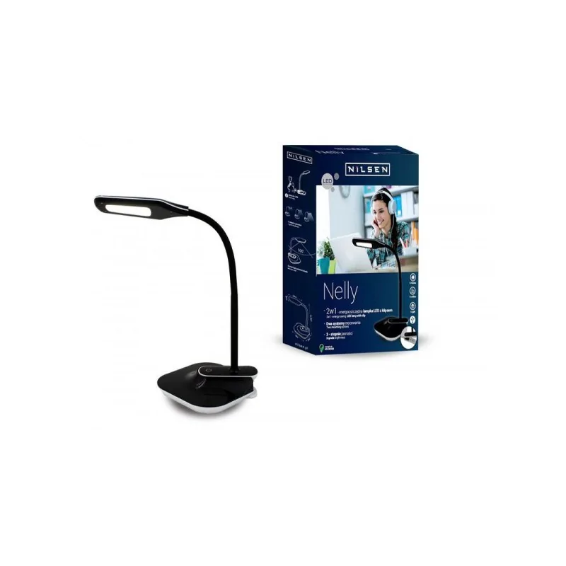 Biurkowa lampka led Nelly PX035 firmy Nilsen jest w kolorze czarnym i idealnie spisze się w biurze. Dzięki elastycznej konstrukcji skierujesz promień światła w dowolnym kierunku. Led-owa lampka na biurko posiada wbudowany port USB, który umożliwi Ci ładowanie telefonu. Produkt można zamontować standardowo na biurku lub za pomocą klipsa na krawędzi blatu czy półki. Lampka na biurko firmy Nilsen posiada również 3-stopniową regulację jasności, dzięki której masz możliwość ustawienia odpowiedniego dla siebie natężenia światła. Prezentowany model wyposażony jest w niewymienne źródło światła led o przybliżonym czasie działania do 20000h oraz 15000 cykli on/off. Lampka led świeci neutralnym światłem (4000K), a jej strumień świetlny równy jest 420 lumenów.