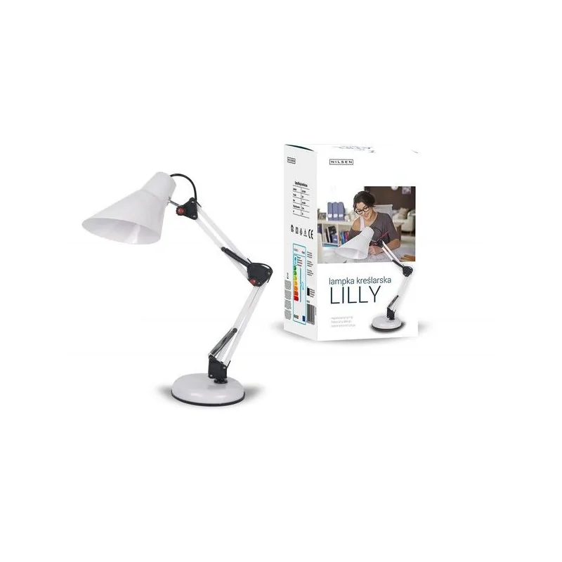 Kreślarska lampka biurkowa w nowoczesnym stylu LILLY FN017 firmy NILSEN to doskonałe rozwiązanie do biura, które umili Ci pracę. Brak źródła światła w zestawie sprawia, że możesz dobrać odpowiednią dla siebie moc i barwę światła żarówki. Zginana, ruchoma konstrukcja pozwoli Ci na skierowanie światła w dowolnie wybrany przez siebie punkt. Biały kolor lampki dopasuje się do każdego wnętrza. Dedykowanym źródłem światła jest żarówka z trzonkiem E27 o maksymalnej mocy 40W. Lampka biurkowa posiada przewód o długości 230 cm, na którym umieszczony został włącznik, dzięki czemu jest łatwa w uruchomieniu.