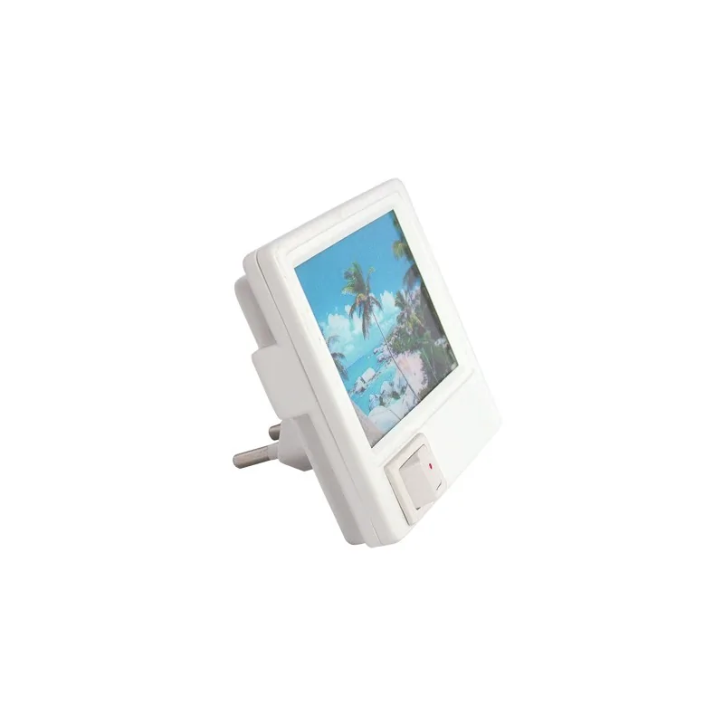 Lampka wtykowa do kontaktu to świetny gadżet oświetleniowy do pokoju Twojego dziecka, nastolatka lub do sypialni. SIMPSON LED IDEUS to lampka wpinana bezpośrednio do kontaktu, która delikatnie przełamuje ciemność w Twoim otoczeniu. Lampa imituje wyglądem obraz z egzotycznym widokiem. Delikatne zimnobiałe podświetlenie generują 4 diody led, o wartości strumienia świetlnego 2.3 lumena każda. Mała lampka do rozświetlenia pomieszczeń przeznaczona jest do użytku wewnętrznego. Jej wymiary to: 70 x 70 x 50 mm. Takie minimalistyczne oświetlenie led do pokoju dziecka jest niezwykle energooszczędne. Moc, z jaką działania oświetlenie ledowe do kontaktu to zaledwie 0.4W.