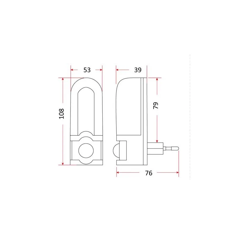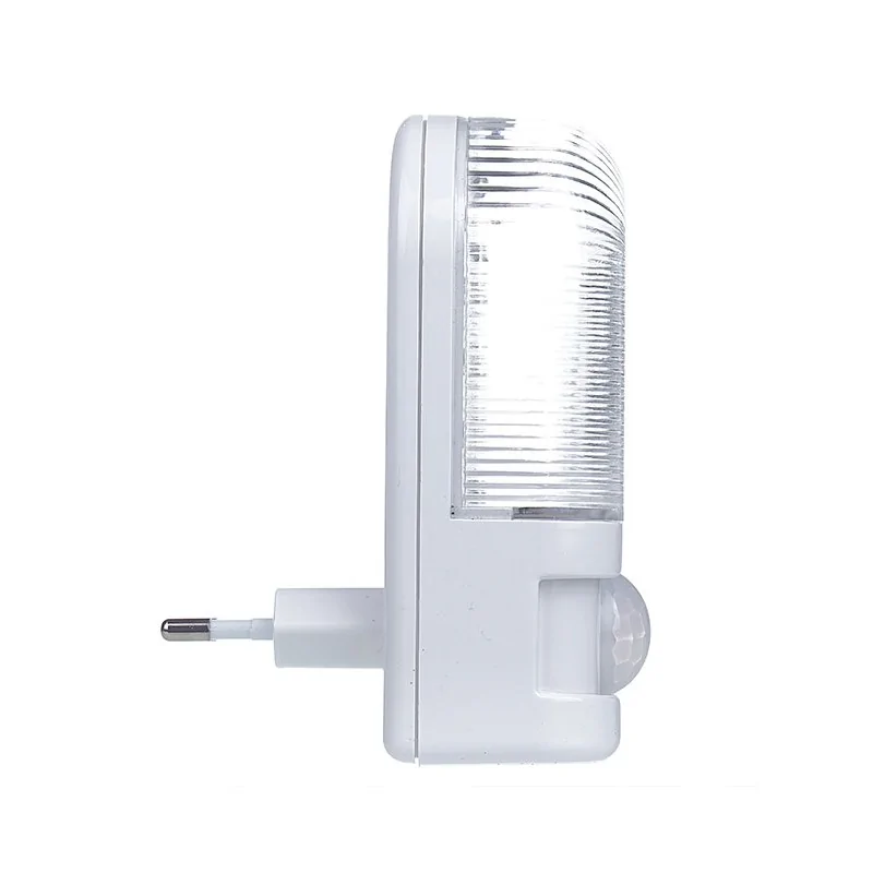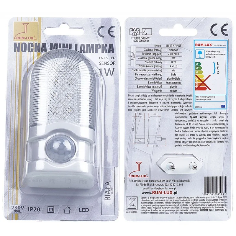 Niewielkich rozmiarów lampka nocna firmy Rum-lux o napięciu zasilania 230V świeci ciepłym białym światłem na poziomie ok. 35 lm i 1W. Lampka zasilana jest sieciowo, bezpośrednio wtykana do gniazdka. Lampka nocna posiada czujnik zmierzchu i ruchu, dzięki czemu zapala się tylko wieczorem po wykryciu przemieszczania się. Lampka do kontaktu idealnie sprawdzi się w pokoju małego dziecka, salonie oraz sypialni jako dyskretne oświetlenie umożliwiające bezpieczne przejście.