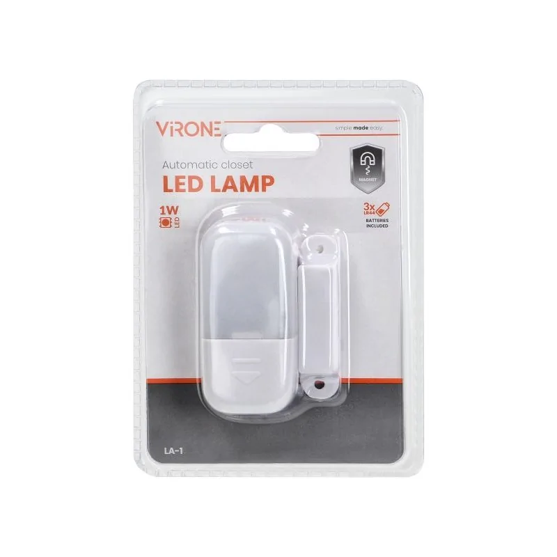 Lampka LA-1 producenta ORNO, służy do oświetlenia wnętrza szaf, szafek, szuflad, schowków, skrzynek itp. Wyposażona jest w diodę LED, a dzięki specjalnemu kontaktronowi światło lampki włącza się poprzez lekkie uchylenie drzwi lub szuflady. Świtało zgaśnie, gdy drzwi lub szuflada zostaną zamknięte. Oświetlenie mocowane jest za pomocą taśm dwustronnych. Lampka zasilana jest trzema bateriami LR44.