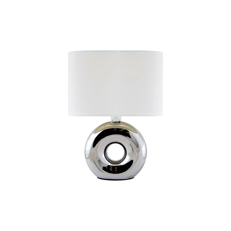 Elegancka chromowana lampka na stolik GOLF to stylowy dodatek pasujący do wielu wnętrz. Estetyczny minimalistyczny biały klosz lampki biurkowej i piękna chromowana podstawa z pewnością przyciągną wzrok każdego z odwiedzających. Lampka w stylu glamour może być świetnym oświetleniem w recepcji, uroczą lampką do hotelu czy dyskretnym oświetleniem na stoliku nocnym w sypialni. Lampka na biurko z białym kloszem przeznaczona jest na wymienne źródło z trzonkiem E14 do mocy 25w, czyli standardową żarówkę z małym gwintem. Wymienne źródło sprawia, iż możesz cieszyć się użytkowaniem lampki przez długie lata (brak żarówki w zestawie). Lampka posiada kompaktowe rozmiary, jest niezwykle lekka, łatwo, więc ją przenosić z miejsca na miejsce ( wysokość 265 mm).