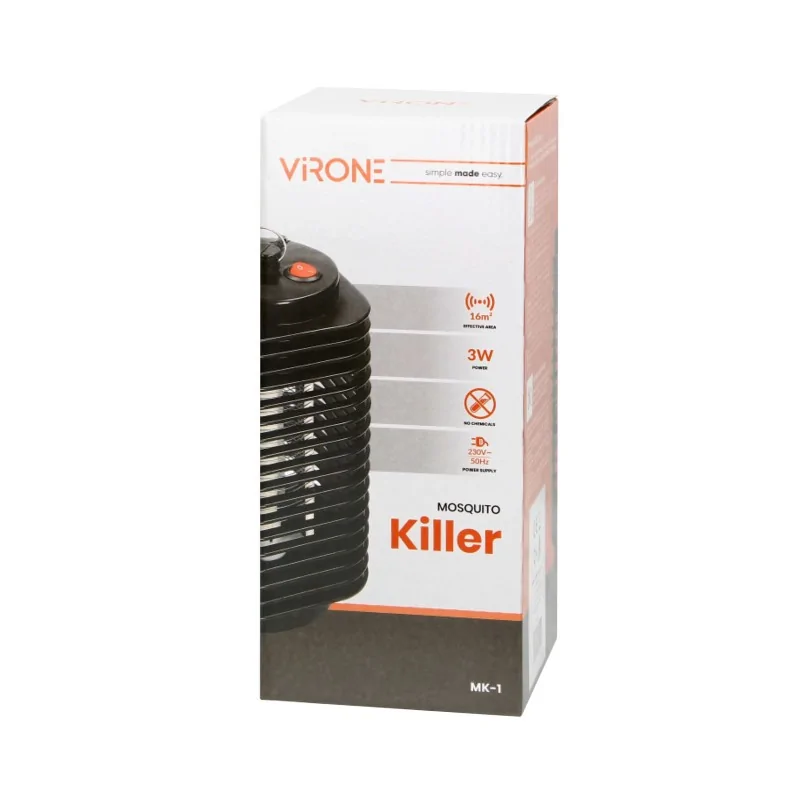 Lampa na komary MK-1 marki VIRONE posiada specjalną barwę oraz moc 3W, co skutecznie przyciąga i eliminuje komary. Urządzenie nie wytwarza żadnych niebezpiecznych substancji chemicznych do otoczenia i jest bezpieczne dla ludzi oraz zwierząt, dlatego idealnie nada się do domów, hoteli czy domków kempingowych w sezonie letnim. Owady po zwabieniu są zabijane przez silny ładunek elektryczny, który został umieszczony na siatce przed źródłem światła, a następnie wpadają do umieszczonego pod spodem pojemnika.