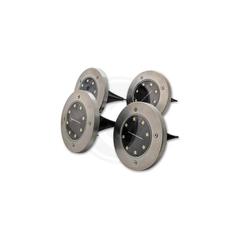 Zestaw 4 okrągłych lamp solarnych wbijanych w podłoże to świetna dekoracja alejek w ogródku, ścieżek na podwórku czy działce. Każda z opraw posiada po 8 diod led świecących zimnym białym światłem na poziomie 35lm. Solarne oświetlenie nie wymaga prowadzenia instalacji elektrycznej-wystarczy samo wbicie w podłoże. Wykończenie ze stali nierdzewnej gwarantuje wysoką jakość i trwałość produktu. Średnica oprawy to 11,5 cm. Lampki posiadają wbudowany czujnik zmierzchu- zapalają się po zapadnięciu zmroku świecąc do ok 6h po pełnym naładowaniu(8-10h).