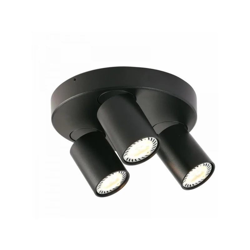 Nowoczesna lampa sufitowa trzy ruchome reflektory na okrągłej podstawie od marki OZZO to doskonałej jakości oświetlenie wykonane z aluminium w czarnej kolorystyce. Klasa szczelności IP20 świadczy o wewnętrznym zastosowaniu lampy. Prezentowana oprawa sufitowa posiada wymienne źródło światła. Przystosowana do żarówek GU10 daje możliwość samodzielnego doboru barwy oraz mocy oświetlenia zgodnie z miejscem przeznaczenia i oczekiwanym efektem końcowym. Jest to niewielka lampa sufitowa idealna do nowoczesnych wnętrz, gwarantująca świetną widoczność oraz zaskakujące efekty wizualne.