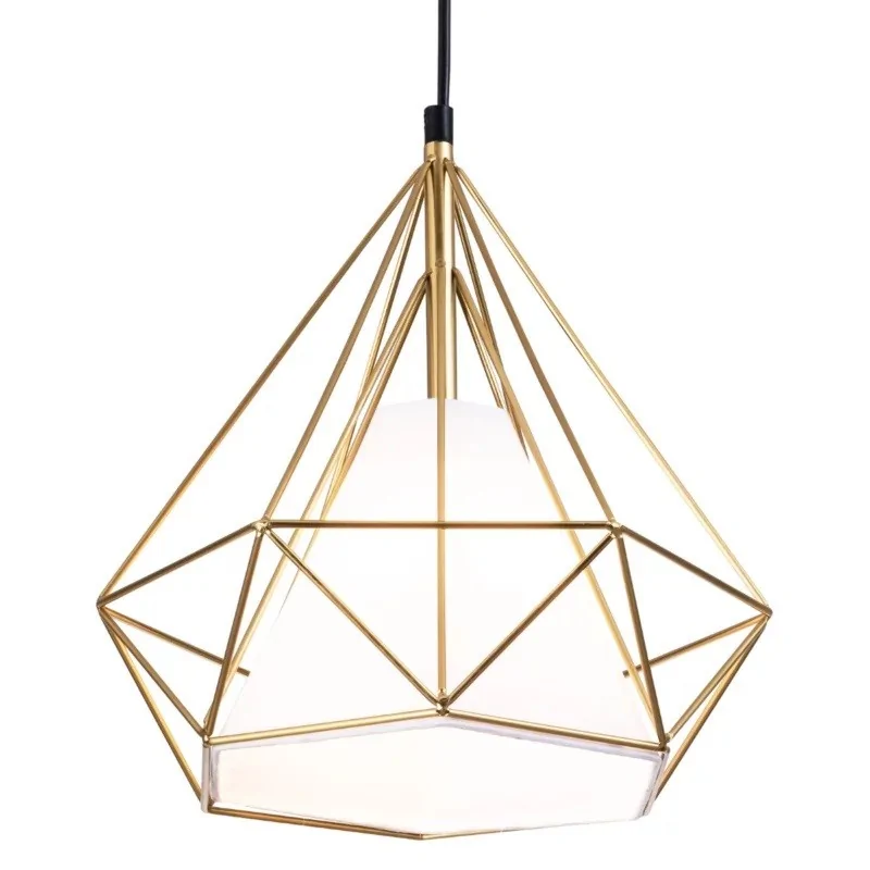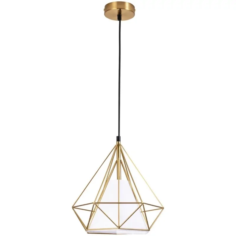 Złota lampa wisząca sufitowa HIRA chrakteryzuje się prostotą i minimalizmem, dzięki czemu będzie pasowała do każdego wnętrza. Produkt wyposażony został w złoty metalowy geometryczny klosz, w którym został umieszony drugi biały klosz na żarówkę. Proponowanym źródłem światła jest żarówka led z trzonkiem E27 o maksymalnej mocy 20W- brak w zestawie. W serii HIRA dostępny jest również kinkiet oraz potrójna lampa sufitowa w wersji czarnej. Wysoka jakość wykonania lampy gwarantuje długą żywotność.