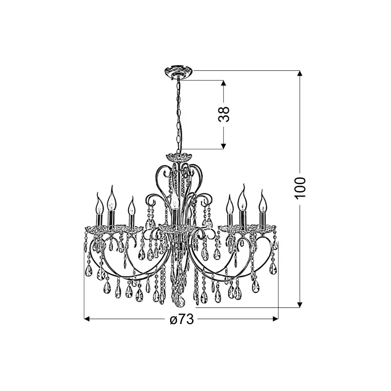 Lampa wisząca AURORA 38-73747 w wyjątkowym połączeniu czarnego metalu i szklanych zwisających kryształków. Idealnie wpasuje się w wnętrza domowe jak również w salach weselnych, bankietowych czy restauracjach. Całość zawieszona jest na wytrzymałym łańcuchu, który umożliwia regulację wysokość. Oświetlenie zostało przystosowane na 8 żarówek o trzonku E27 i do maksymalnej mocy 40W. Brak źródła światła w zestawie pozwala na indywidualne dobranie barwy oraz kształtu żarówki. Marka Candellux oferuje również lampy wiszące, lampę podłogową oraz kinkiety w kolorze złotym i chromowym. Produkt objęty jest gwarancją producenta.