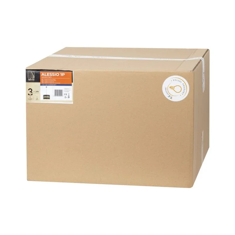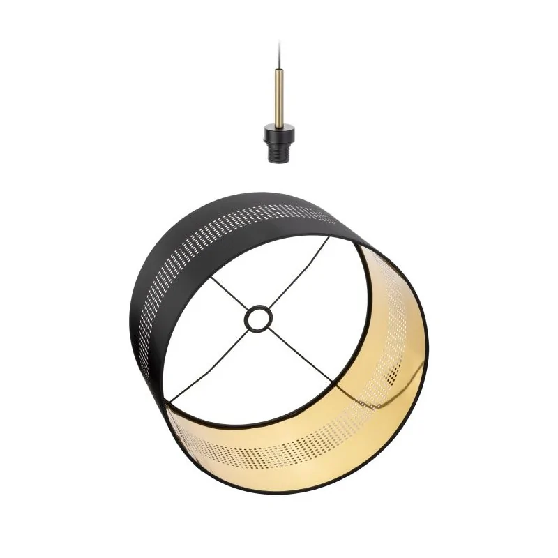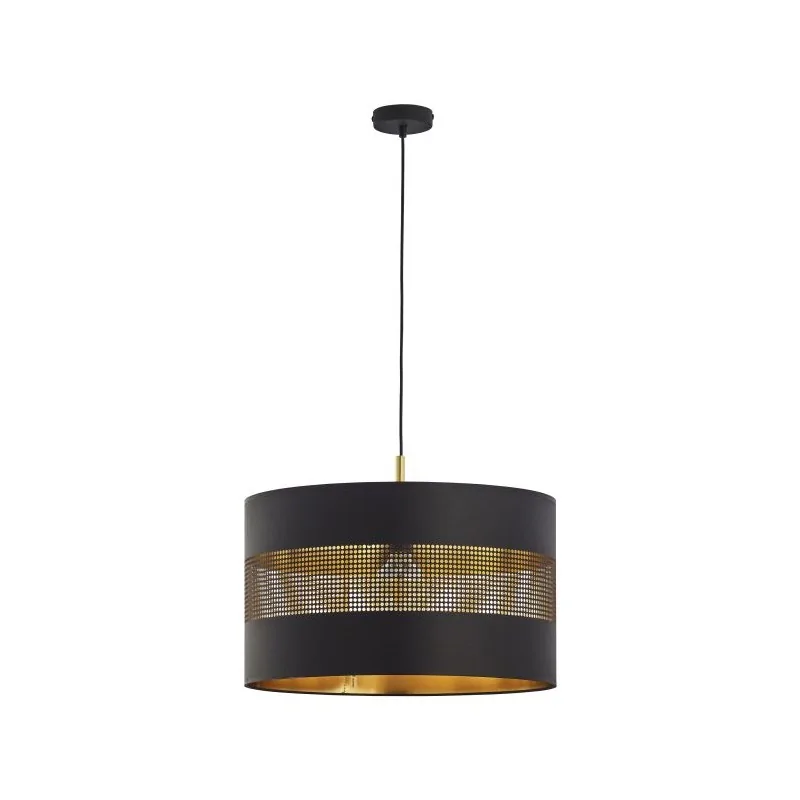 Lampa wisząca ALESSIO jest wykonana w nowoczesnym stylu przez markę ORNO. Czarny abażur wykonany z holenderskiej tkaniny, który od środka został powleczony złotą folią, dzięki czemu pięknie oddaje światło, a dodatkowym atutem, są wycinane laserowo drobniutkie otwory w kształcie kwadratu, które przepuszczając światło tworzą na ścianach delikatne wzorki. Oświetlenie wiszące posiada oprawkę na tradycyjną żarówkę E27 do max mocy 60W (brak w zestawie). Dostępna jest także wersja z czterema źródłami światła.