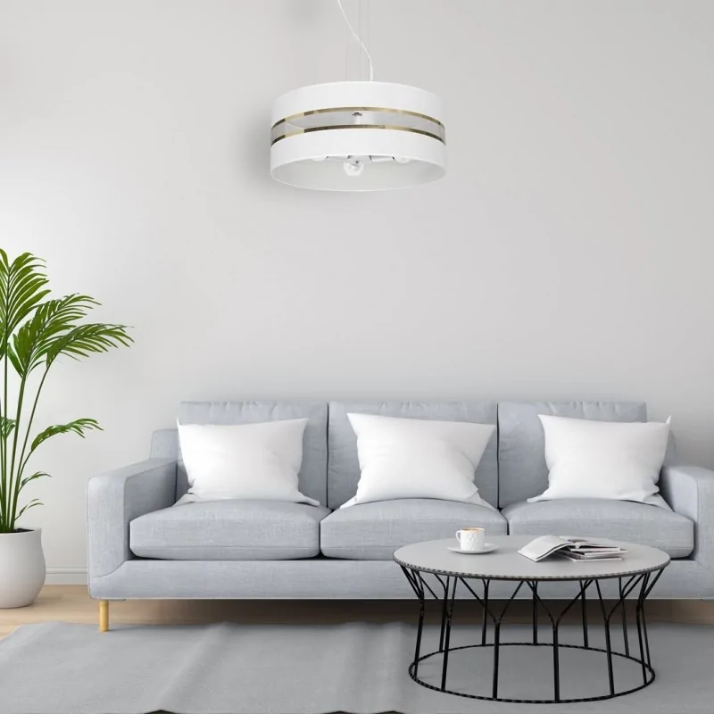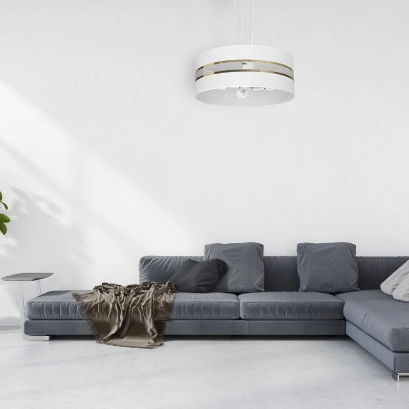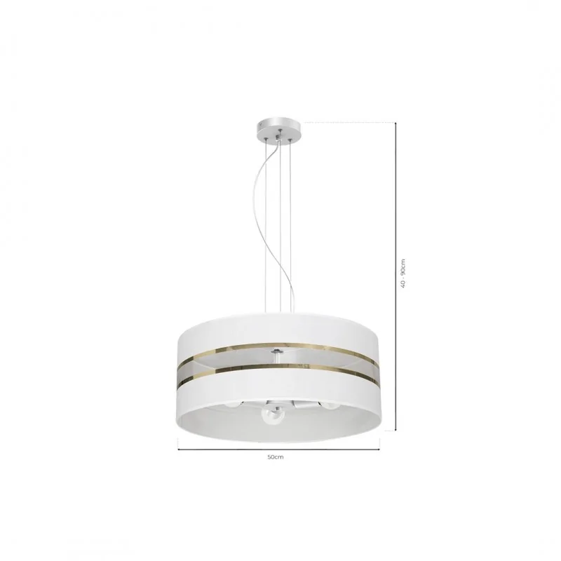 Lampa wisząca MLP7353 z kolekcji ULTIMO polskiej marki EKO-LIGHT, znakomicie sprawdzi się zarówno w nowoczesnych wnętrzach, jak i w przestrzeniach klasycznych oraz urządzonych w pełnym blasku klimacie glamour. Okrągły biały klosz, po środku posiada przeźroczysty element, ukazujący wnętrze lampy oraz ozdobiony jest złotymi paskami. Oświetlenie bez problemu dopasujemy do każdego rodzaju wnętrz, a to za sprawą regulowanej wysokości od 90 do 50 cm, poprzez ucięcie przewodów, ułatwia to również klosz o średnicy 50cm. W lampie należy zamontować 3 żarówki o trzonku E27 do max mocy 60W (brak w zestawie), możemy wybrać energooszczędne żarówki LED. W serii ULTIMO dostępnych jest aż 20 modeli lamp w kolorze białym i czarnym.