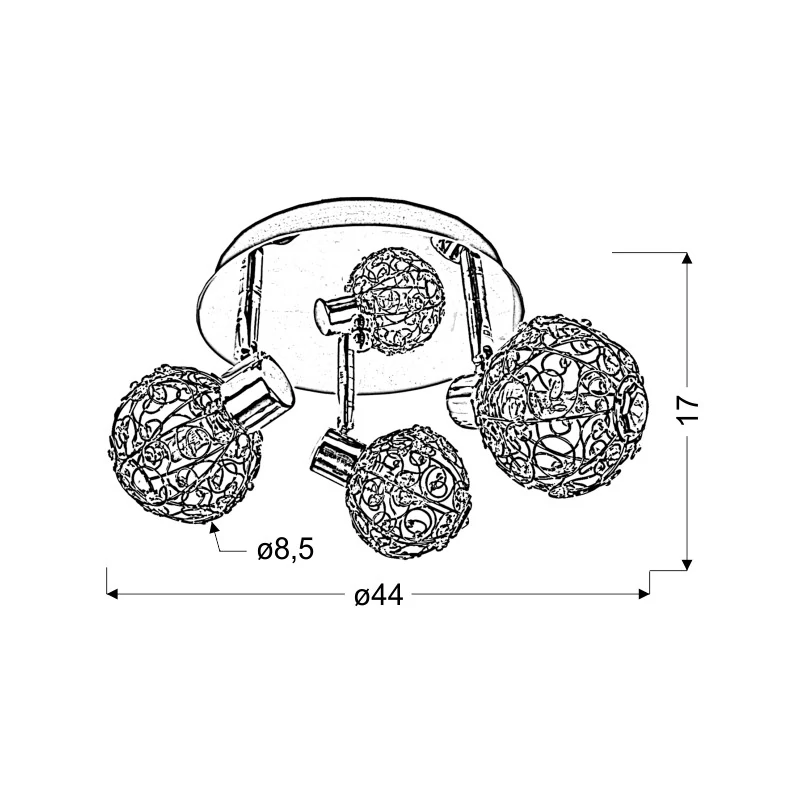 Plafon 98-13750 COLLAR, to funkcjonalna i dekoracyjna propozycja oświetleniowa, która urozmaici każde wnętrze. Charakterystyczne druciane klosze zdobione są akrylowymi koralikami i zawieszone na chromowej podstawie, całość twory klimatyczny i relaksujący efekt w pomieszczeniu. Lampa posiada ruchome klosze, które możemy dowolnie ustawiać w pionie i poziomie. Oświetlenie marki Candellux, przystosowane jest na trzy żarówki o gwincie G9 do maksymalnej mocy 40W ( brak w zestawie). Szykowności i elegancji w pomieszczeniu z pewnością nada zestawiona cała seria COLLAR. Produkt objęty jest gwarancją producenta.