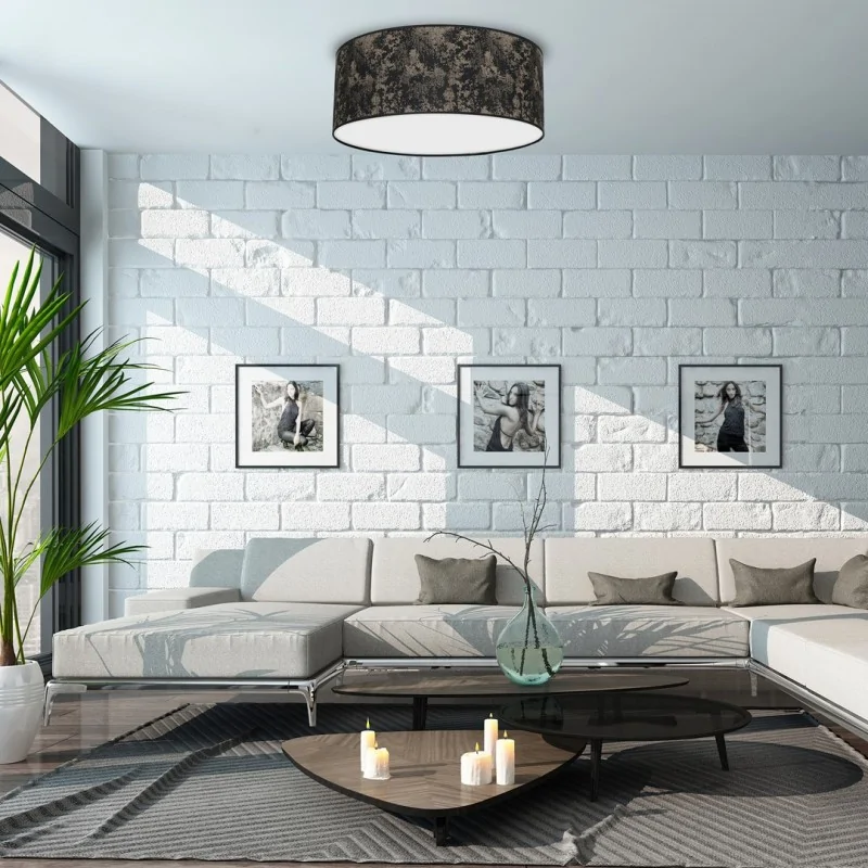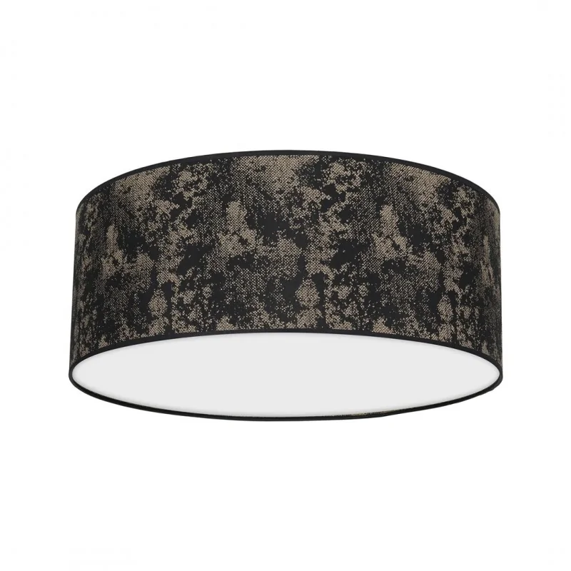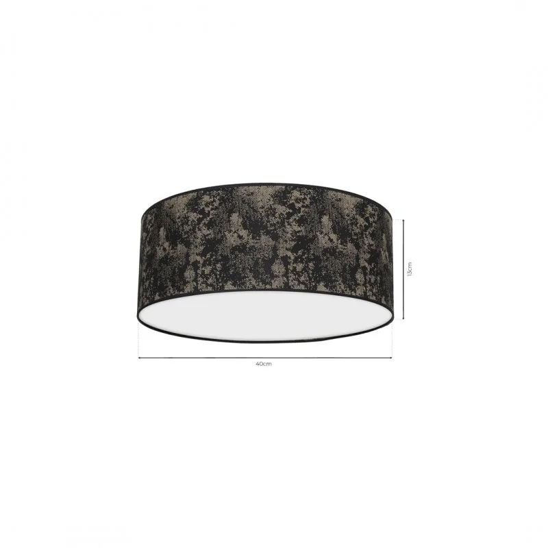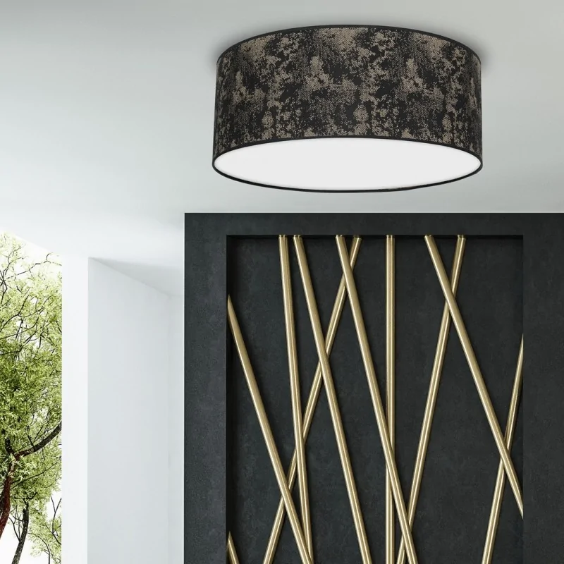 Okrągła lampa sufitowa SATINO MLP7317, w kolorze czarnym, posiada złote prześwity, które tworzą nietuzinkową strukturę. Tkaninowy abażur przyjemnie przepuszcza strumień świetlny, dodatkowo dla bezpieczeństwa usztywniony jest metalowy elementami. Oświetlenie mierzy 13cm wysokości, natomiast średnica wynosi 40cm. Jest to propozycja zaprojektowana i wykonana przez polską markę EKO-LIGHT, do której należy dobrać dwie żarówki o gwincie E27 do max mocy 60W - możemy umieścić energooszczędne żarówki LED. Do kompletu polecamy wybrać inne lampy z serii SATINO, które liczą aż 20 modeli.
