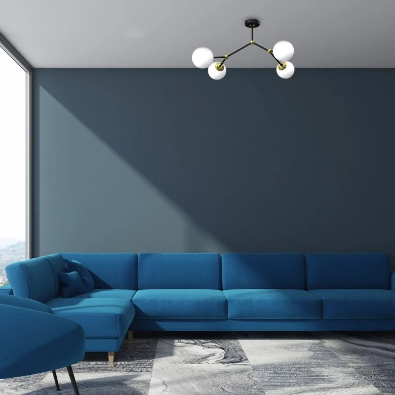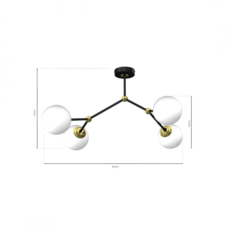 Ponadczasowe oświetlenie sufitowe MLP7461 z kolekcji JOY zostało zaprojektowane i wykonane przez polskiego producenta EKO-LIGHT. Oryginalnym elementem są nierównomiernie rozstawione klosze, które tworzą nietuzinkową konstrukcję oraz są w stanie oświetlić znacznie większą przestrzeń. Szerokość wynosi aż 60cm, natomiast wysokość to 27cm. Czarna metalowa podstawa połączona ze szklanymi kloszami i złotymi elementami, jeszcze bardziej podkreśla wyjątkowy charakter oprawy. Lampa wisząca przystosowana jest na 4 żarówki o trzonku E14 do max mocy 40W - polecamy zamontować energooszczędne żarówki LED. W serii JOY, dostępnych jest 16 modeli.