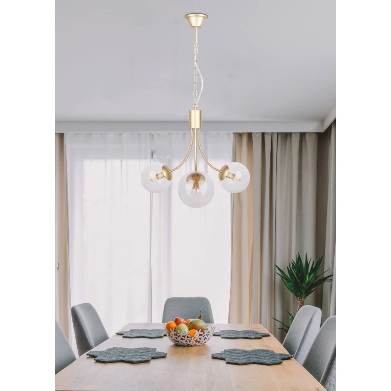 Nowoczesna lampa sufitowa DANI 33-79015 marki Candellux, zawieszona jest na mosiężnym łańcuchu, od którego odchodzą wygięte ramiona zakończone ozdobnymi, nowoczesnymi, szklanymi kloszami, osłaniającymi źródła światła. Możliwość regulacji wysokości, podnosi jej walory użytkowe i pozwolą na zastosowanie nawet w niższym pomieszczeniu. W żyrandolu zastosowano 3 źródła światła na gwint E14 do max mocy 40W. Wykonany w niej dwuobwodowy sposób zaświecania, w połączeniu z zastosowaniem podwójnego włącznika ściennego zapewni dostosowanie ilości światła do preferencji użytkowania i zapotrzebowania. Oświetlenie dostępne jest także w wersji pięciopunktowej. Produkt objęty gwarancją producenta.
