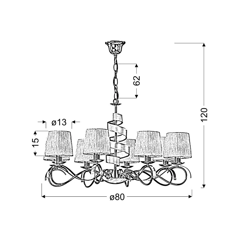 Designerska lampa sufitowa DENIS 38-23452, w kolorze aluminium o rozłożystych ramionach przyozdobiona została metalową złotą wstęgą. Wykończenie tego typu podkreśla wyjątkową elegancję materiału. Żyrandol wymaga przestrzeni - jest duży i rozłożysty. Oświetlenie wiszące marki Candellux ma miejsce na 8 żarówek o gwincie E14 i do maksymalnej mocy 40W (brak źródła światła w zestawie). Zwis zawieszony jest na łańcuchach, które umożliwiają regulację wysokość. Idealnie nadaje się do dużego salonu, holu hotelowego oraz sal bankietowych czy weselnych. Ramiona lampy wykończone białymi kreszowanymi abażurami, które od środka usztywnione są PCV. Polecamy zapoznać się z rozbudowaną serią DENIS. Produkt objęty jest gwarancją producenta.