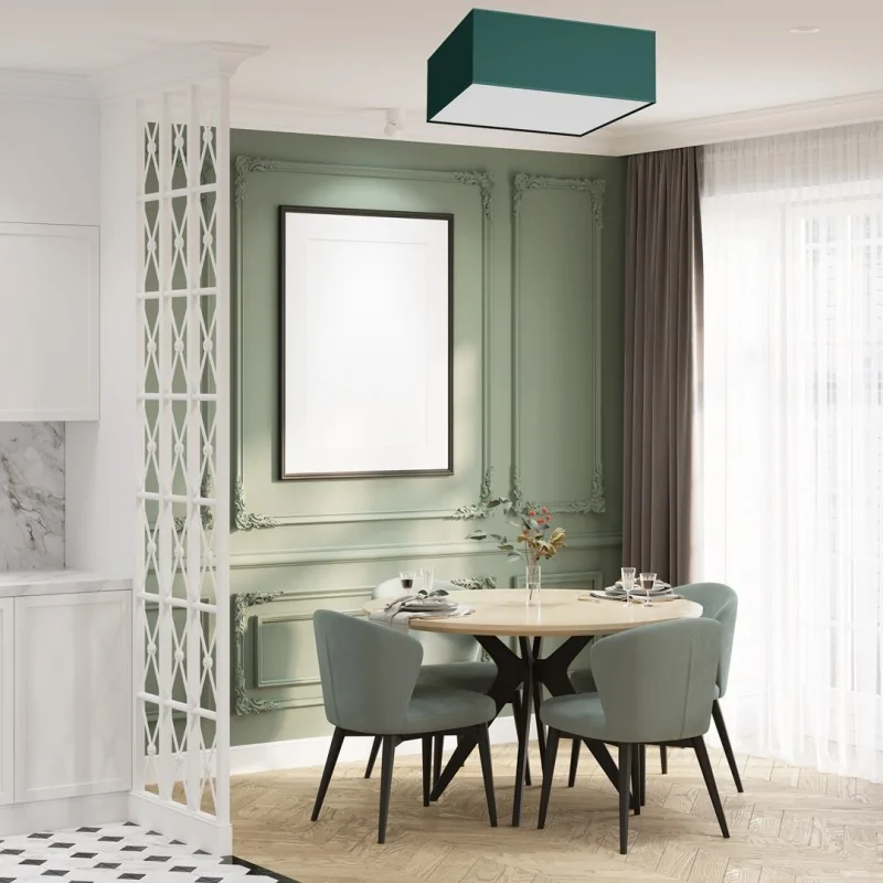 Oświetlenie sufitowe MLP7875 z kolekcji VERDE, znakomicie sprawdzi się zarówno w nowoczesnych wnętrzach, jak i w przestrzeniach klasycznych i urządzonych w pełnym blasku klimacie glamour. Ciemno zielony klosz z tkaniny jest hitem kolorystycznym już dobrych kilka lat, a prosta kwadratowa konstrukcja nadaje nieco delikatności. Jest to propozycja Polskiej marki EKO-LIGHT, do której należy wybrać 3 żarówki o gwincie E27 do max mocy 60W. Lampa mierzy 50cm szerokości oraz 13cm wysokości. Polecamy zapoznać się z całą serią VERDE, która łącznie w kolekcji ma 10 różnych opraw.