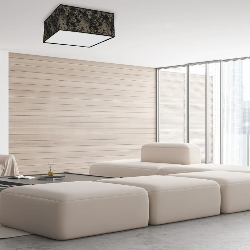 Prezentowane oświetlenie MLP7315 z kolekcji SATINO, polskiego producenta EKO-LIGHT, wykonane zostało w minimalistycznej formie, lecz o oryginalnym wzorze na kloszu. Połączenie czerni z delikatnym złotem, idealnie wkomponuj się we wnętrza np. w stylu glamour. Szerokość oprawy to 50cm, natomiast wysokość wynosi 13cm. Lampa sufitowa posiada miejsce na 3 żarówki o gwincie E27 (brak w zestawie). Tkaninowy klosz, usztywniony od wewnątrz metalowymi elementami, przyjemnie i delikatnie rozprasza światło we wnętrzu. Ten model dostępny jest w różnych wymiarach o okrągłej formie oraz w postaci lampki nocnej, lampy wiszącej, podłogowej i kinkietu.