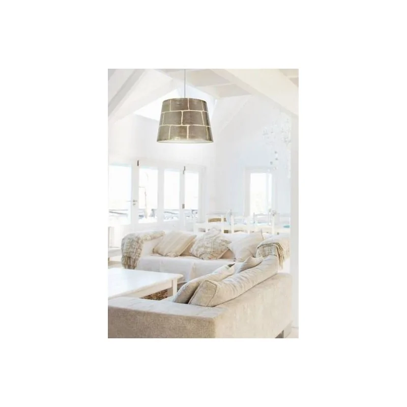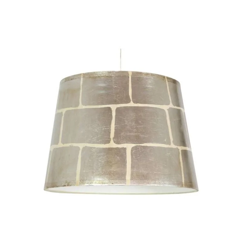 Lampa sufitowa AMERICANO producenta CANDELLUX, posiada nieszablonowy abażur z tworzywa, malowany wzór imitujący mur z cegieł w kolorze srebrnym. Zawieszona jest na transparentnej lince, którą możemy skrócić, dzięki czemu odpowiednio dopasujemy wysokość do otoczenia. Oświetlenie sufitowe posiad oprawkę na żarówkę o gwincie E27 do max mocy 40W (brak w zestawie). Lampa mierzy 110cm wysokość, natomiast średnica klosza to 35cm. Ten model dostępny jest również w wersji złotej w paski.