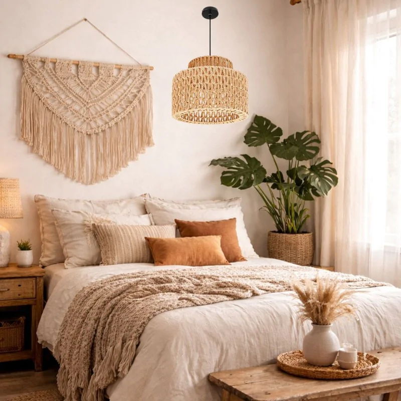 Lampa zapewnia komfortowe, miękkie oświetlenie, które sprzyja wypoczynkowi i podkreśla walory dekoracyjne wnętrza. Jej uniwersalny design doskonale sprawdzi się w salonie, sypialni, korytarzu czy jadalni, harmonijnie komponując się z aranżacjami w stylu boho, skandynawskim i nowoczesnym.