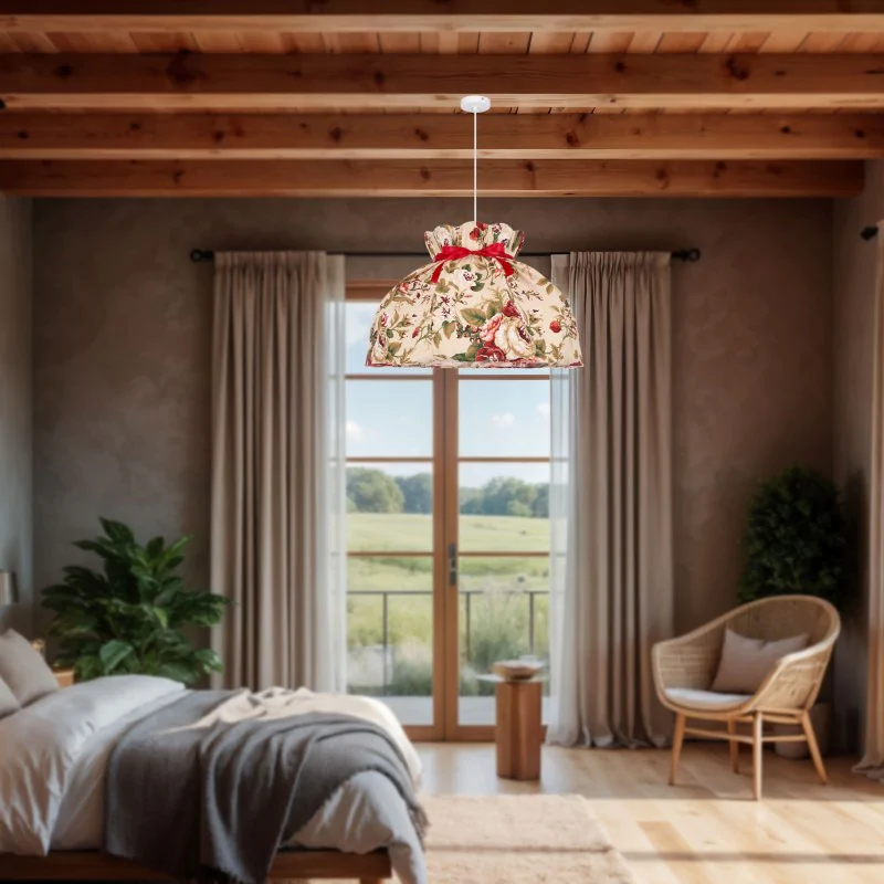 Materiał wykonania: zawiesie stalowe, abażur tkaninowy. Kolor podstawy: biało czerwony. Wysokość: 130. Szerokość: 52. Głębokość: 52. Wymiary (wys. x szer. x gł.): 130x52x52. Waga netto: 0,65. Rodzaj trzonka: E27.