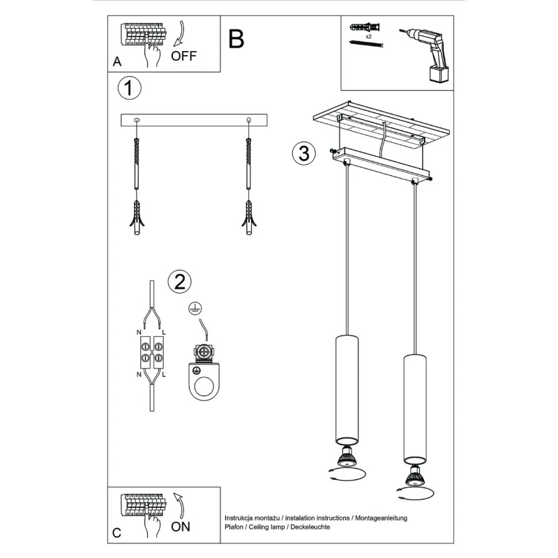 - Źródło światła: GU10, 2x max 10W LED, ~230V, 50Hz, IP20, klasa ochronności I
