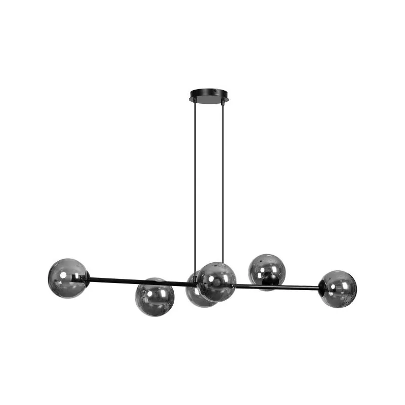Oświetlenie wiszące z kolekcji LETO marki ORNO, wykonane w Polsce, będzie mocnym akcentem dekoratorskim w każdym pomieszczeniu. Zastosowane materiały – czarny stalowy korpus oraz klosze z przezroczystego szkła o grafitowym odcieniu– nadają lampie bardzo futurystycznego sznytu, nawiązującego odrobinę do kul Newtona. Produkt nadaje się do montażu natynkowego w pomieszczeniach suchych. Lampa wisząca przystosowana na 6 żarówek z gwintem E14, o maksymalnej mocy 40W każda (brak w zestawie). Zastosowanie wymiennego źródła światła pozwala każdemu użytkownikowi na indywidualny dobór rodzaju żarówki i na dostosowanie jej barwy światła do własnych preferencji. Oświetlenie mierzy 100cm szerokości i 110 cm wysokości. Ten model lampy dostępny jest równię w formie ośmiopunktowej oraz w kolorze złoto-czarnym.