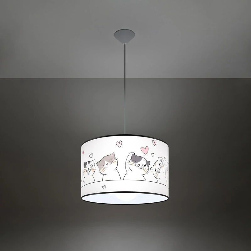 Lampa wisząca do pokoju dziecięcego CAT jest dostępna w 2 rozmiarach: z kloszem o średnicy 30 i 40 cm. Dzięki temu możesz lepiej dobrać ją do wielkości pomieszczenia. Nic nie stoi na przeszkodzie, by tworzyć kompozycje oświetleniowe z kilku lamp - ile pomysłów, tyle możliwości!