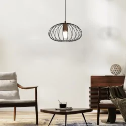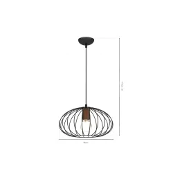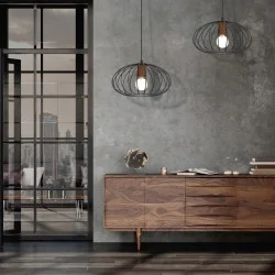 Lampa wisząca MERIDIANO MLP7959 marki EKO-LIGHT, w kolorze czarnym wykonana została z metalu oraz posiada drewniany element nad żarówką. Zastosowanie bardzo modnego obecnie klosza klatkowego w kształcie elipsy zapewnia maksymalne oświetlenie pomieszczenia. Oprawę bez problemu dopasujemy do każdego wnętrza, a ułatwia to regulacja wysokości od 50 do 90 cm, poprzez skrócenie przewodu, natomiast średnica klosz wynosi 36cm. Oświetlenie przystosowane jest na tradycyjne źródło światła o gwincie E27. Ze względu na ażurowy klosz, dla stworzenia niepowtarzalnej konstrukcji polecamy wybrać dekoracyjną żarówkę np. w stylu Vinatge. W serii MERIDIANO znajdują się 4 lampy.
