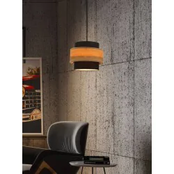 Oryginalna lampa wisząca 31-17871 z kolekcji TWIN producenta CANDELLUX, posiada czarny klosz ozdobiony drewnianym elementem. Takie połączenie tworzy nietuzinkową konstrukcję oraz przyjemnie rozprasza światło we wnętrzu. Oświetlenie wiszące posiada oprawkę na tradycyjną żarówkę o gwincie E27 do max mocy 60W - źródło światła nie jest dołączone do zestawu. Tkaninowy abażur usztywniony został PCV, dzięki czemu cała konstrukcja jest solidna i wytrzymała. Oprawa mierzy 20cm szerokości, natomiast regulowana wysokość, poprzez skrócenie przewodu mierzy 100cm wysokości. W serii TWIN dostępne są 4 modele lamp.