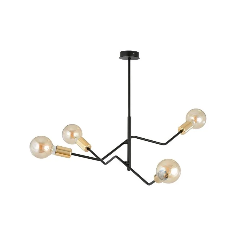 Lampa wisząca z kolekcji GIRO marki ORNO, wyprodukowana została w Polsce o ponadczasowej formie w kolorze czarno-złotym. Brak kloszy sprawia, że oprawa maksymalnie rozprasza światło we wnętrzu, dzięki czemu nada się zarówno do mn8iejszych jaki tych loftowych wnętrz. Oświetlenie wiszące przystosowane jest na 4 żarówki o gwincie E27 do max mocy 60W - brak w zestawie. Ze względu na odsłonięte źródło światła polecamy wybrać dekoracyjne żarówki np. z filamentem, które nadadzą niepowtarzalności całej konstrukcji. Lampa mierzy 53cm wysokości i 66cm szerokości. Do kompletu możemy dobrać kinkiety i podwójną oraz sześcioramienną lampę wiszącą.