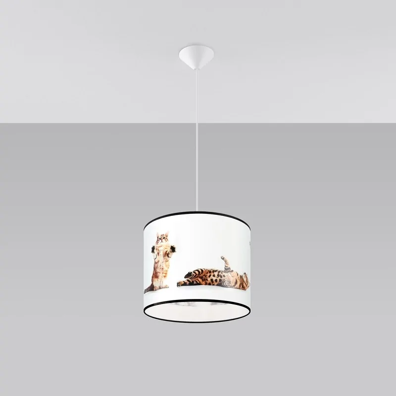 Lampa wisząca do pokoju dziecięcego KOTY jest dostępna w 2 rozmiarach: z kloszem o średnicy 30 i 40 cm. Dzięki temu możesz lepiej dobrać ją do wielkości pomieszczenia. Nic nie stoi na przeszkodzie, by tworzyć kompozycje oświetleniowe z kilku lamp - ile pomysłów, tyle możliwości!