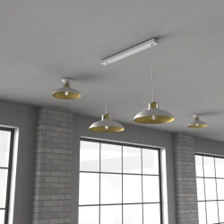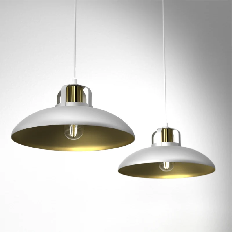Wyjątkowa lampa wisząca MLP7705 z kolekcji FELIX polskiej marki EKO-LIGHT, to prawdziwa gratka dla miłośników eklektycznych przestrzeni i niebanalnych akcesoriów we wnętrzach. Białe klosze ze złotym wnętrzem maksymalnie rozpraszają strumień światła w pomieszczeniu, a to za sprawą odsłoniętych żarówek, które nie zostały dołączone do zamówienia, dlatego możemy wybrać ozdobne modele - koniecznie o trzonku E27. Spore wymiary lampy sprawiają, że lampa dopasuje się do dużych, przestronnych wnętrz ale także do tych z ograniczoną przestrzenią, sprawia to regulowana wysokości od 50 do 90 cm. W skład tej rodziny wchodzi 5 modeli oświetlenia – kinkiet, lampa sufitowa, pojedyncza i podwójna lampa wisząca oraz lampka biurkowa – w trzech różnych wariantach kolorystycznych. Do wyboru jest klasyczna biel, szlachetny granat i niezwykle modna butelkowa zieleń, zawsze ze stylowymi, złotymi akcentami.