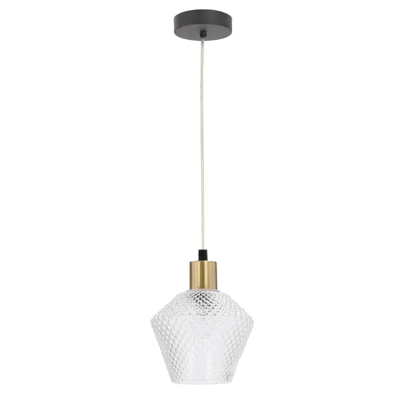 Materiał wykonania: zawiesie stalowe, klosz szklany. Kolor podstawy: czarny + złoty. Wysokość: 120. Szerokość: 14. Głębokość: 14. Wymiary (wys. x szer. x gł.): 120x14x14. Waga netto: 0,62. Rodzaj trzonka: E14.