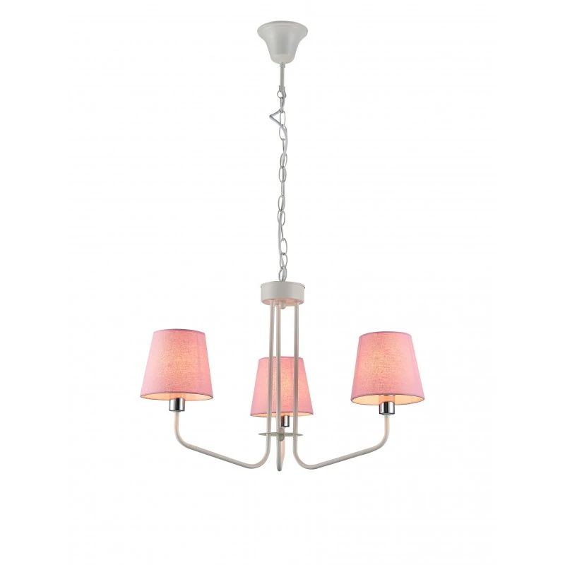 Klasyczna lampa wisząca 50203097 z serii YORK marki LEDEA, wykonana w delikatnym odcieniu różowym oraz tradycyjnej bieli. Posiada metalową konstrukcję, która zakończona jest trzema tkaninowymi kloszami. Doskonale nada się zarówno do pokoi dziecięcych jak i salonów czy kuchni. Wymiary zwisu wynoszą: wysokość - 44cm oraz szerokość - 53cm. Do lampy należy dobrać trzy żarówki o trzonku E14 do maksymalnej mocy 60W. W serii YORK znajdziemy również lampy wiszące w kilku innych kolorach oraz lampki biurkowe i kinkiety. Produkt objęty jest gwarancją producenta.