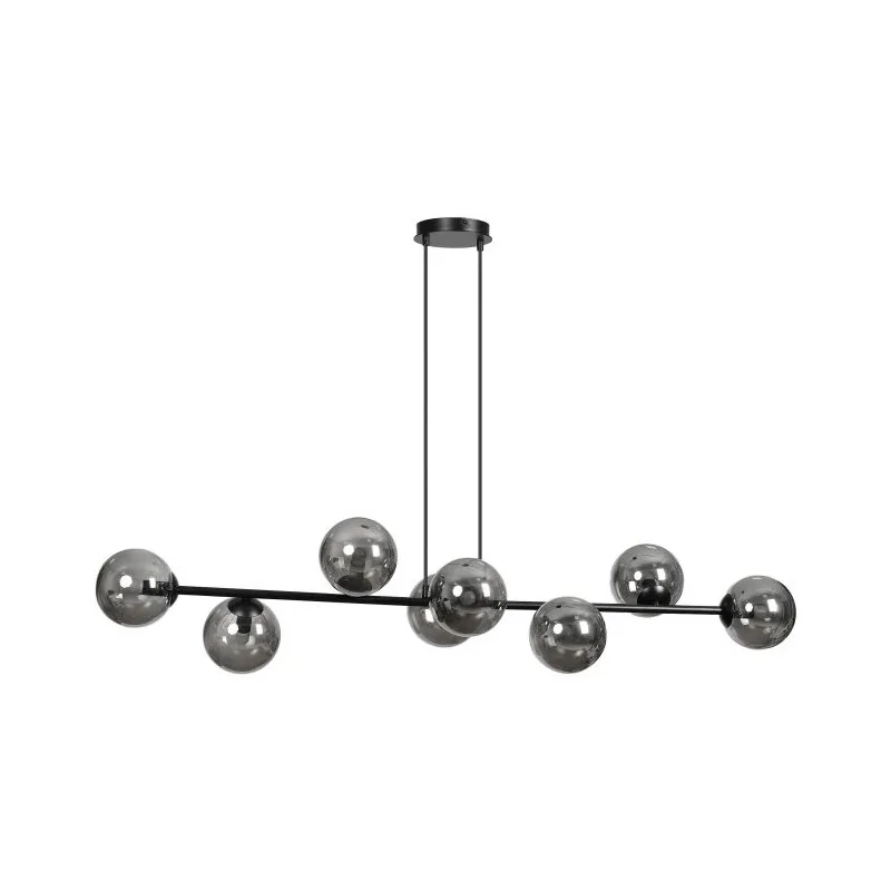 Oświetlenie wiszące z kolekcji LETO marki ORNO, to efektowna lampa wykonane w Polsce, która z pewnością będzie mocnym akcentem dekoratorskim w każdym pomieszczeniu. Zastosowane materiały – czarny stalowy korpus oraz klosze z przezroczystego szkła o grafitowym odcieniu– nadają lampie bardzo futurystycznego sznytu, nawiązującego odrobinę do kul Newtona. Produkt nadaje się do montażu natynkowego w pomieszczeniach suchych. Lampa wisząca przystosowana na 8 żarówek z gwintem E14, o maksymalnej mocy 40W każda (brak w zestawie). Zastosowanie wymiennego źródła światła pozwala każdemu użytkownikowi na indywidualny dobór rodzaju żarówki i na dostosowanie jej barwy światła do własnych preferencji. Listwa mierzy 130cm szerokość, natomiast wysokość to 100cm, spore wymiary lampy, sprawiają, że świetnie będzie wyglądał w dużych, przestronnych wnętrzach. Ten model dostępny jest również w wersji sześciopunktowej oraz w złotym kolorze.