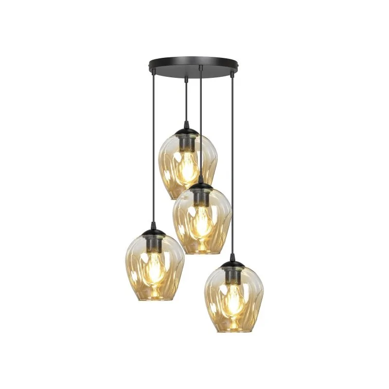 Efektowna lampa wisząca z kolekcji IRIS marki ORNO, wyprodukowana w Polsce, świetnie sprawdzi się w loftowych, przestronnych wnętrzach. Złoto - czarna kolorystyka wpasuje się w nowoczesne pomieszczenia np. w stylu gamour. Oświetlenie wiszące przystosowane jest na 4 źródła światła o tradycyjnym gwincie E27 do max mocy 60W (brak w zestawie). Ze względu na transparentne, złote klosze, polecamy wybrać dekoracyjne żarówki, które podkreślą wyjątkowy charakter lampy. W naszej ofercie dostępne są różne warianty kolorystyczne szklanych kloszy: grafitowe, transparentne, złote oraz mix kolorów. Produkt przystosowany do montażu natynkowego w pomieszczeniach suchych.