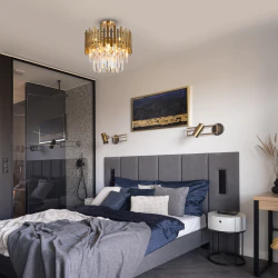 Elegancka i luksusowa lampa sufitowa z kolekcji ASPEN polskiej marki EKO-LIGHT, zachwyca znakomitym designem, dbałością o szczegóły i precyzją wykonania. Do jej stworzenia wykorzystano wysokiej jakości metal oraz kryształowe elementy, które niezwykle efektownie rozpraszają światło. Klosz wykonany w kolorze złotym o dwóch warstwach, idealnie dopasuje się do wnętrz w stylu glamour. Jest to wyjątkowa lampa sufitowa, która stanowi ukłon w stronę miłośników luksusowych i niezwykle wyrafinowanych dodatków. Żyrandol przystosowany jest do 6 żarówek o gwincie E14 (brak w zestawie), dzięki czemu poradzi sobie w dużych, przestronnych pomieszczeniach. Oświetlenie sufitowe mierzy 45cm szerokości i wysokości. W kolekcji ASPEN 8 modeli lamp w kolorze złotym oraz chromowym.
